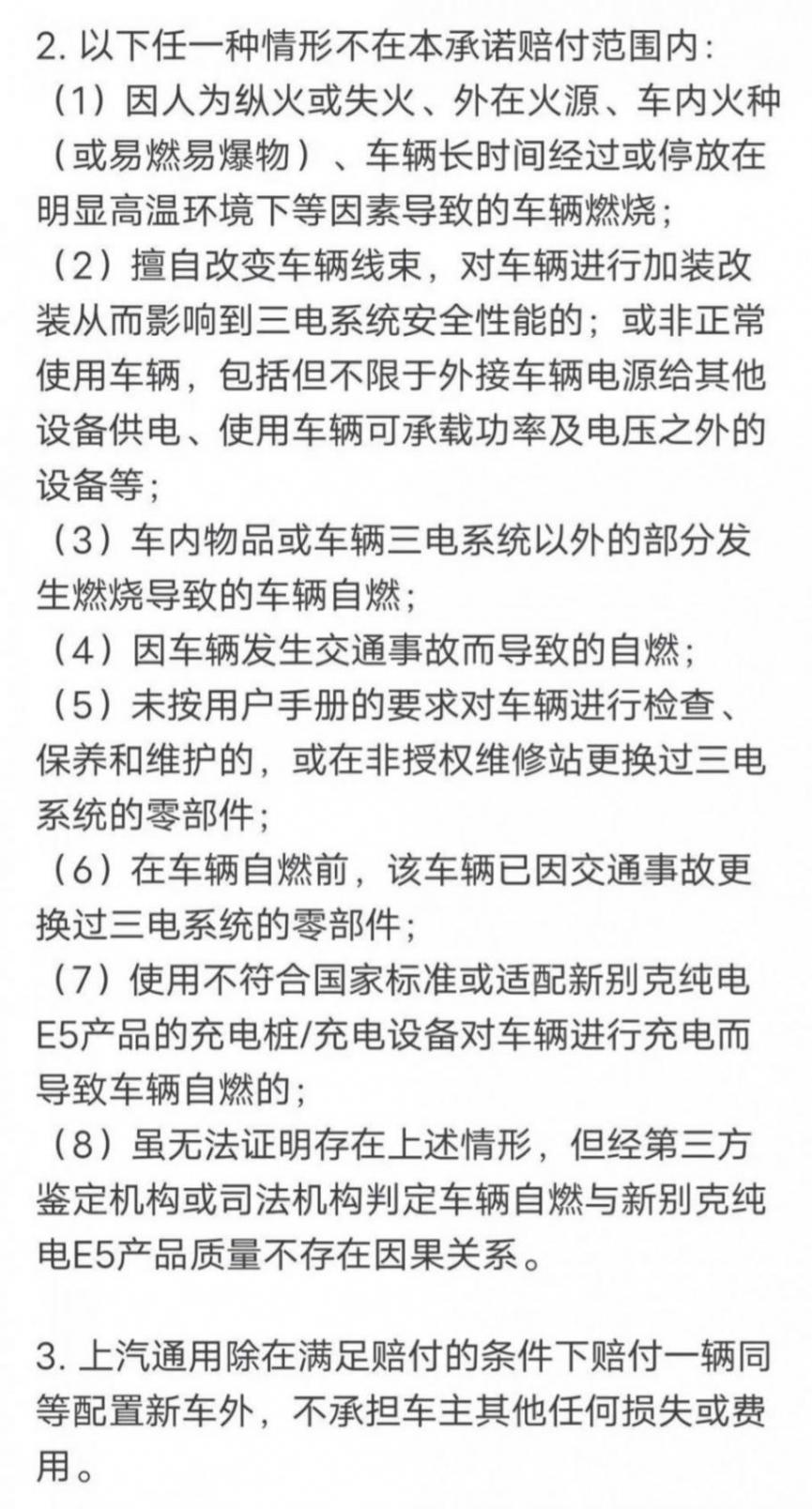 在別克純電E5的訂車界面中,《預訂權益告知書》對該權益做了進一步解釋:本次“零自燃承諾”中的三電系統質量瑕疵是指新別克純電E5車輛的三電系統存在不符合國家標準的質量瑕疵且該等質量瑕疵與車輛自燃存在直接因果關系(已宣布召回的除外)。緊隨其后,告知書列舉了里寫不在承諾賠付范圍內的情形,包括因交通事故導致的自燃等。