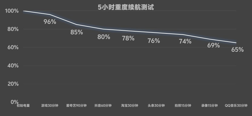 經過中關村在線五小時重度續航測試,vivo X Fold5最終剩余電量65%,足以滿足一天使用需求。配合80W有線閃充、40W無線閃充及反向充電功能,30分鐘可以充入66%的電量,完全充滿用時僅需50分鐘整。