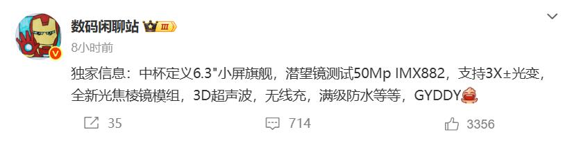 影像上還是很猛,后置5000萬像素大底主攝像頭+5000萬像素超廣角攝像頭+5000萬像素潛望式長焦攝像頭,有消息成主攝可能會升級成2億像素,具體就等發布了,這款手機雖然是小屏旗艦,但性能、續航、屏幕、拍照等都很強,也有不錯的散熱和內存組合,還是很值得期待的。