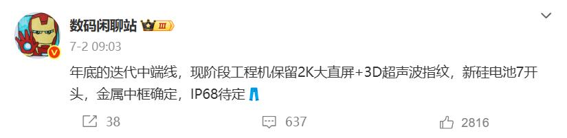 電池容量會有所提升,大概做到6500mAh-7000mAh之間,并支持90w有線充電+40w無線充電,外圍支持超聲波指紋、NFC、紅外、雙揚聲器、x軸馬達、IP68/IP69頂級防水、雙頻GPS。