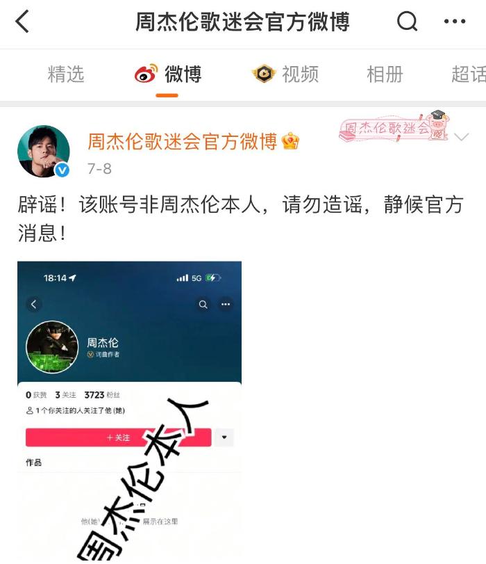 除了名為“周同學(xué)”賬號(hào)外,還有賬號(hào)直接取名為“周杰倫”,并且認(rèn)證為詞曲作者。對(duì)此,周杰倫歌迷會(huì)官方微博也發(fā)布辟謠消息,“該賬號(hào)非周杰倫本人,請(qǐng)勿造謠,靜候官方消息!”