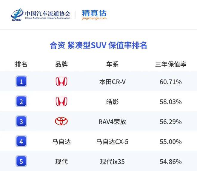 據(jù)中國汽車流通協(xié)會和精真估聯(lián)合發(fā)布的《2025上半年中國汽車保值率研究報告》顯示,東風本田CR-V憑借60.71%的三年保值率,位列合資緊湊型SUV保值率第一名。