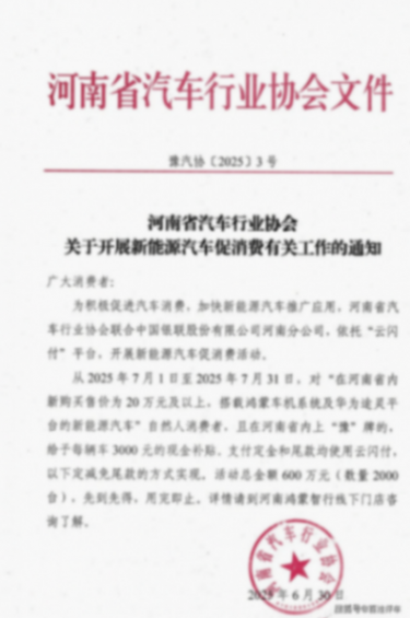 河南省汽車行業協會發布通知,開展新能源汽車促消費活動,每輛車給予3000元現金補貼。車輛要求是售價20萬元及以上,搭載鴻蒙車機系統及華為途靈平臺的新能源汽車,且在河南省內上豫牌。數量有限,先到先得。不只河南一地,全國多個地方都推出了針對鴻蒙智行旗下車型3000元購車補貼政策。