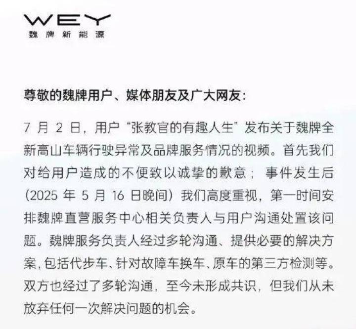 面對輿論壓力,魏牌在 7 月 3 日發布了長達 16 天的溝通記錄,試圖還原事件全貌。這份詳盡的 "溝通日程表" 顯示,品牌方先后提供了代步車、換新車、第三方檢測等解決方案,但均被張教官以 "誠意不足"為由拒絕。值得注意的是,魏牌特別指出高山車型已交付近萬輛,此前從未出現類似故障,這一數據在后續爭議中成為關鍵佐證。然而,張教官團隊卻抓住汽車召回網檢測資質問題大做文章,甚至譏諷魏牌員工欺上瞞下,這種情緒化的表達進一步激化了矛盾。