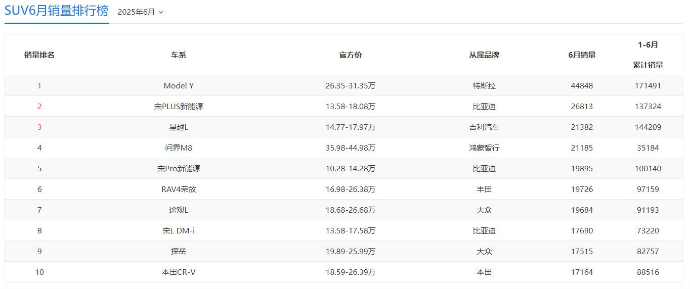 2025年6月的汽車零售銷量數(shù)據(jù)均已確認(rèn),SUV的排行榜同步出爐,這份榜單可能會讓一些汽車愛好者感到意外。