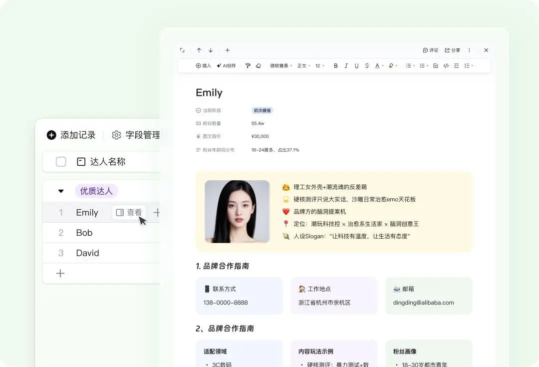 在釘釘的AI表格更新中,基于自然語言的數據分析、嵌入表格的AI字段,表格即文檔、表格自動化流程是主要新功能。其中,“表格即文檔”功能被釘釘重點強調,旨在將表格打造成企業知識庫,將過去表格+外鏈的格式統一在一張表里,實現檢索效率的提升。