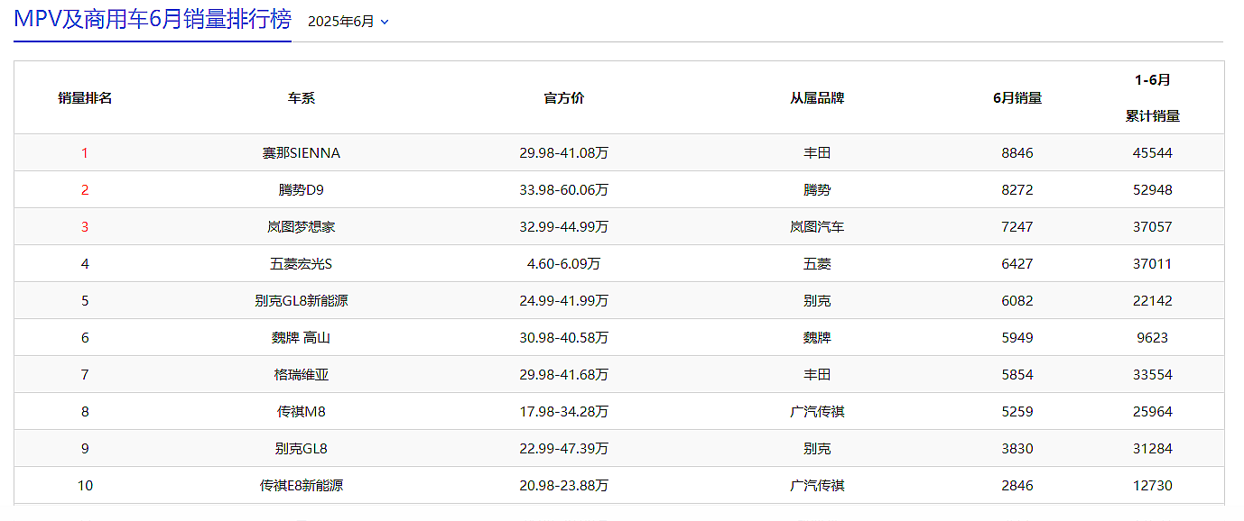 2025年6月份 ,MPV的冠軍車型不是騰勢D9、也不是別克GL8,竟然是豐田賽那!是不是有些出乎預料?