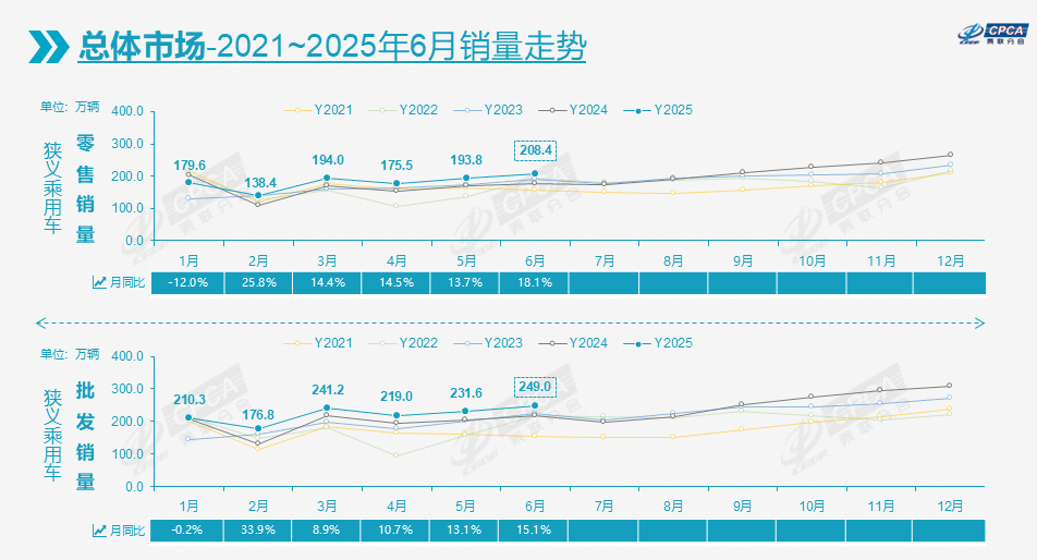 回到整體市場來看,數據顯示6月國產狹義乘用車零售銷量同比增長18.1%至208.4萬輛,這是同期歷史上首次超過200萬輛。