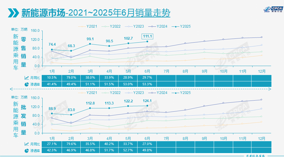 這也使得6月新能源在國內零售市場的滲透率再創歷史新高達到53.3%。因此,盡管今年1月零售的新能源滲透率只有41.5%,但得益于6月的強勢走高,加上3月至5月零售的新能源滲透率分別達到51.1%、51.5%、52.9%,上半年才得以首次沖過50%的門檻。