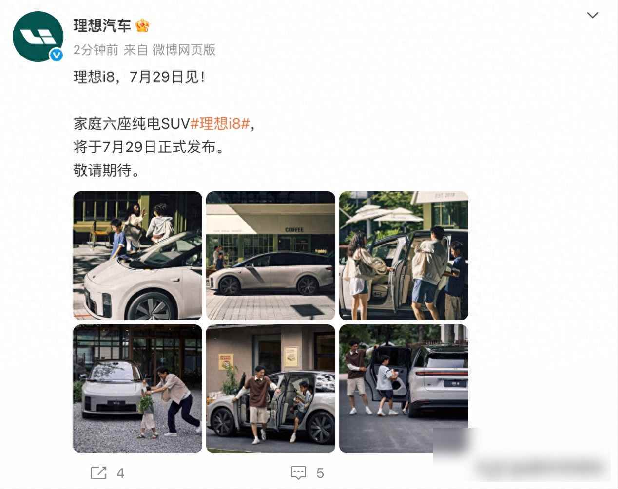 理想汽車7月29日要發新車了,這次是純電SUV叫理想i8。尺寸和L8差不多,六座布局,全系雙電機四驅,激光雷達這些都標配,預計賣35萬以上。這車用上了5C電池,官方說充10分鐘能跑500公里,但充電樁得自建。