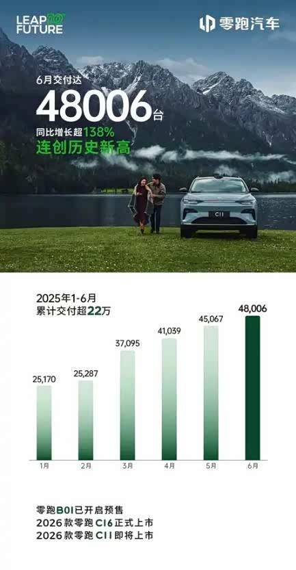 2025年上半年,零跑以221664臺的成績領跑,連續四個月占據領先位置,6月單月48006臺的銷量更是助力其在二季度拉開差距。理想憑借203938臺的銷量緊隨其后,小鵬以197189臺位列第三。