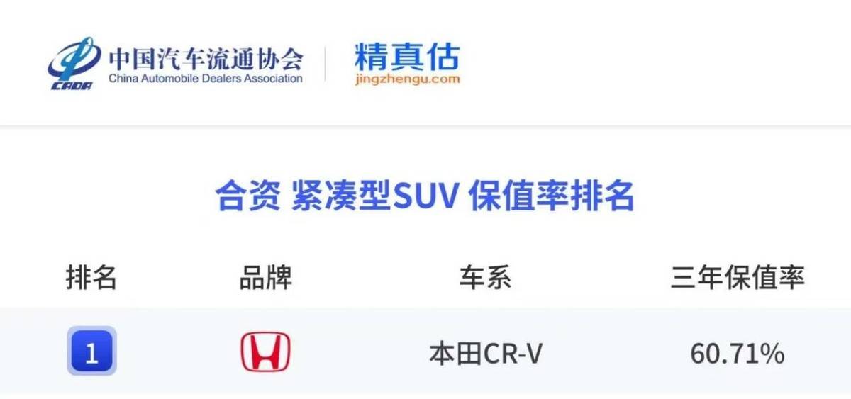 第一個是保值率。中國汽車流通協會的數據顯示,CR-V三年保值率60.71%,合資緊湊型SUV里排第一。這意味著你花20萬買輛CR-V,三年后想換車,還能拿回12萬多。在二手車市場里,這種硬通貨屬性,本質是市場用真金白銀投票——大家相信它的可靠性。