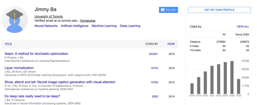 在谷歌學術中,他的論文過去五年被引用22萬次之多,是當之無愧的學術大牛。其中2014年的論文《Adam: A Method for Stochastic Optimization》更是“爆款”,和 Diederik P. Kingma聯合提出的 Adam已經是目前深度學習工作流默認引用的優化算法之一,幾乎所有模型論文都會點一次名,在計算機視覺、自然語言處理等領域被廣泛應用。