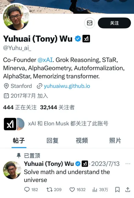 2023年7月xAI成立時,吳宇懷以聯合創始人的身份加入。