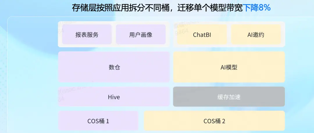 在底層COS存儲(chǔ)設(shè)立兩個(gè)桶,雖然緩解了大數(shù)據(jù)和AI大模型數(shù)據(jù)在使用時(shí)對(duì)帶寬需求的壓力,但AI大模型數(shù)據(jù)存儲(chǔ)桶自身,也仍面臨著需要非常高的帶寬吞吐能力。