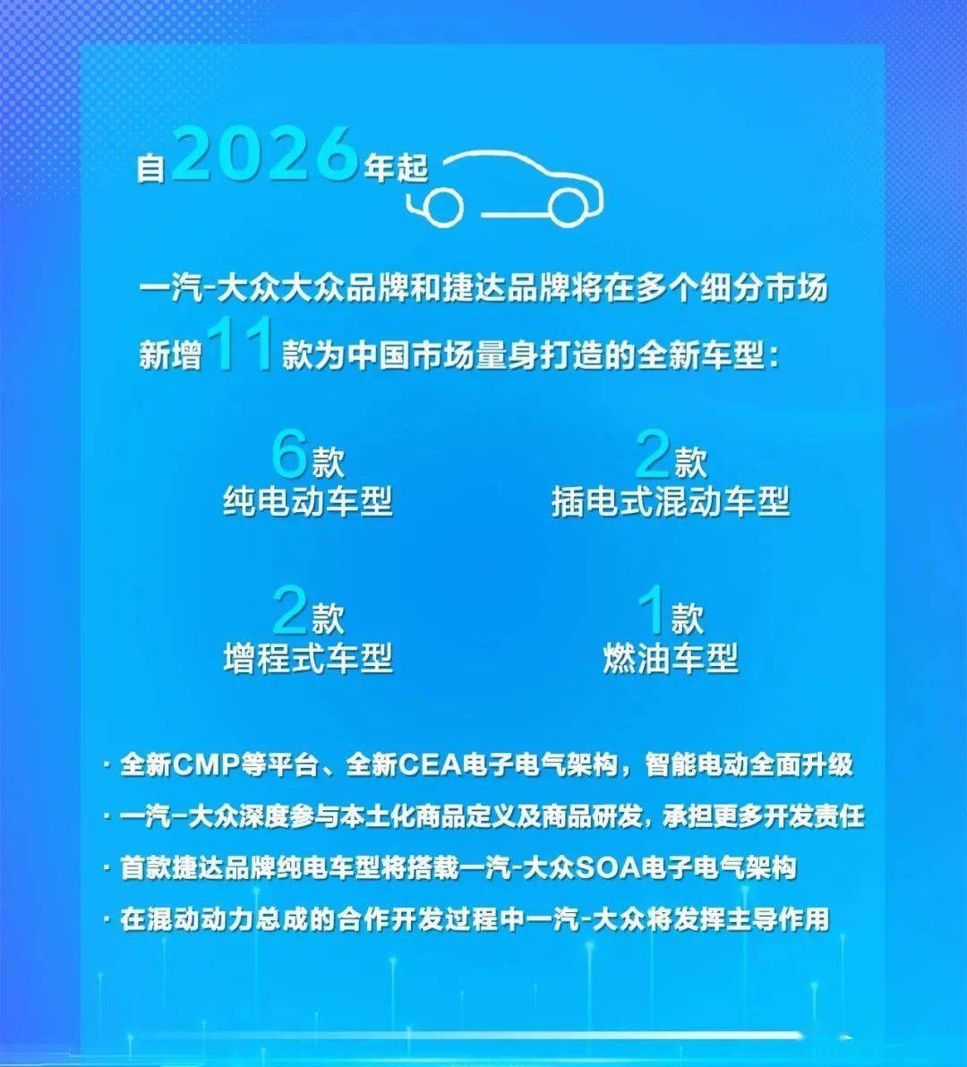 一汽-大眾大眾品牌的電動化亦在加速推進,在2025上海車展上,官方發布ID. AURA的概念車,其出自于CMP平臺概念車,定位純電緊湊型轎車。自2026年起,一汽-大眾大眾品牌針對中國客戶需求將推出的10款全新車型,包括5款純電車型、2款插電混動、2款增程式混動和1款全新燃油車型,聚焦多條賽道全面出擊,加速電動智能化轉型,為消費者帶來多元化的新品選擇。