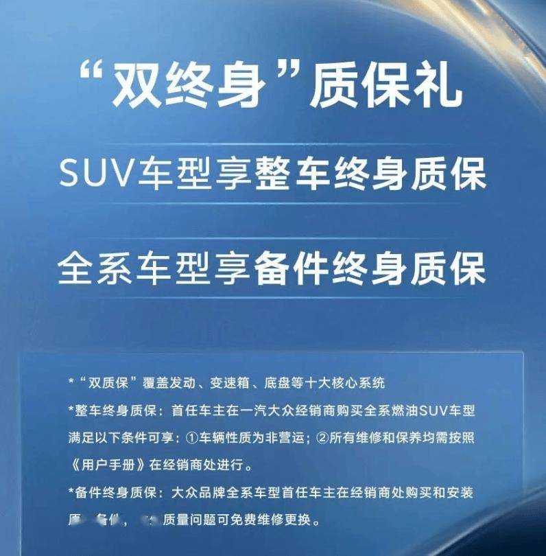 “雙終身質保”政策是指整車終身質保和原裝備件終身質保,政策絕非營銷噱頭,而是基于一汽-大眾的體量優勢去卷品質和服務,把權益落實至用戶端,該政策覆蓋發動機、變速箱、底盤等十大核心系統,全國聯保,無年限里程限制,為用戶帶來全生命周期的用車保障。