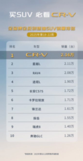 其中,4-5月CR-V連續登頂合資燃油SUV上險量榜首,第18-22周終端零售銷量更是超越星越L、RAV4榮放,以2.16萬輛穩居第一。