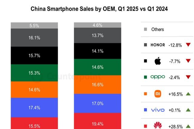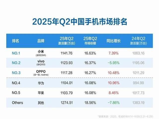 2025年上半年華為硬生生從蘋果手里搶回中國市場(chǎng)第一的寶座,小米咬得死緊,蘋果直接掉出前三。