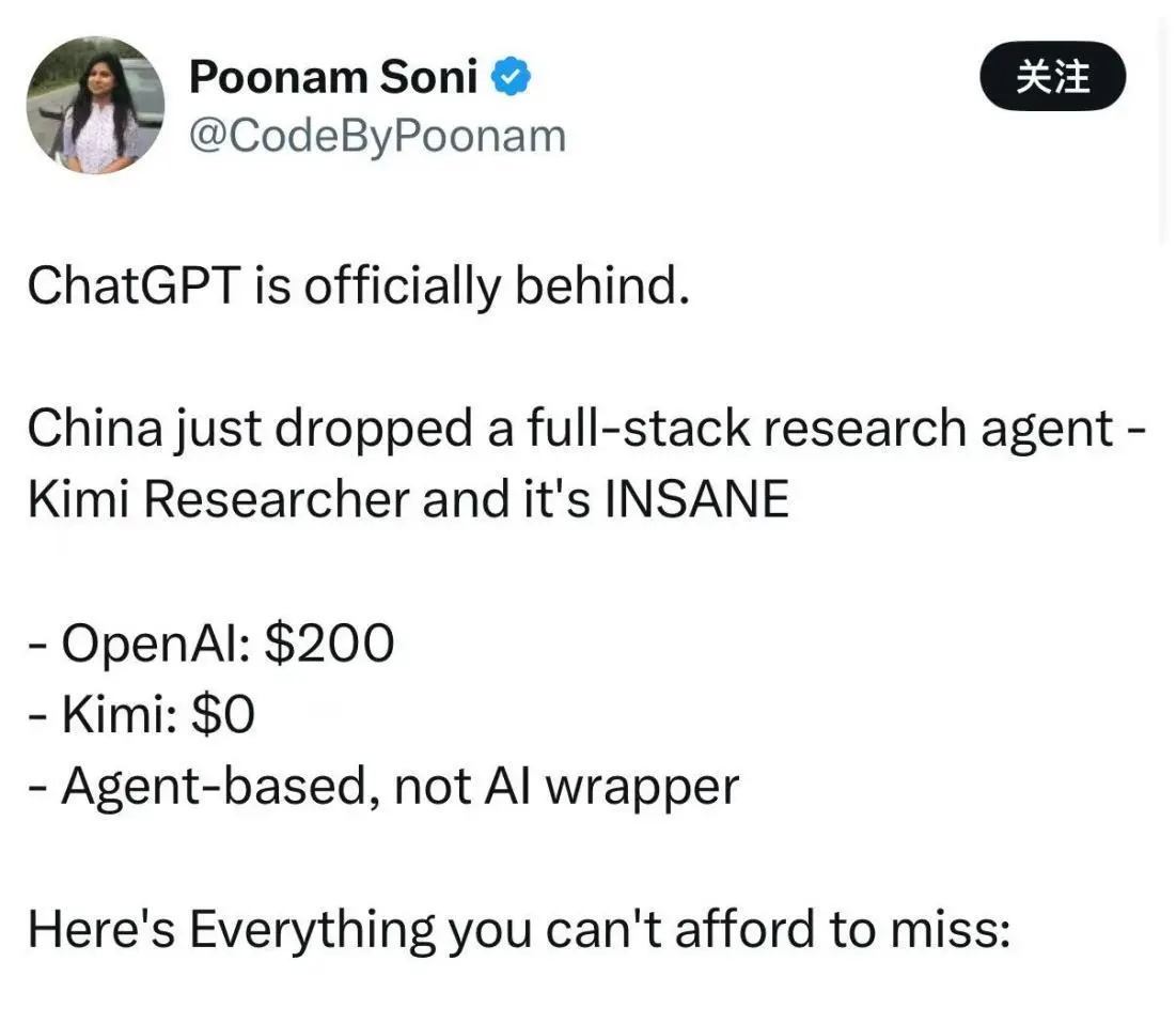 AI創(chuàng)業(yè)者Poonam Soni發(fā)文表示,ChatGPT已經(jīng)落后,來自中國的Kimi發(fā)布的Researcher產(chǎn)品令人驚嘆,是基于模型的Agent,而不是簡(jiǎn)單的工具套用。