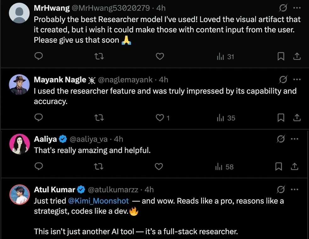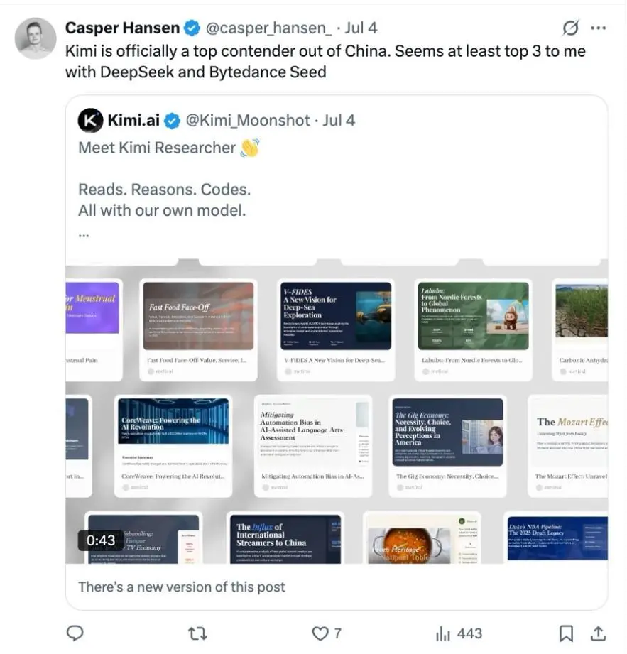 在海外社交媒體上,AI從業(yè)者紛紛表達(dá)著對(duì)這款來自中國AI產(chǎn)品的喜愛,有網(wǎng)友表示,Kimi Deep Researcher可能是用過的最好的深度研究模型,視覺效果出色。也有博主表示,對(duì)深度研究的能力和準(zhǔn)確性印象深刻。
