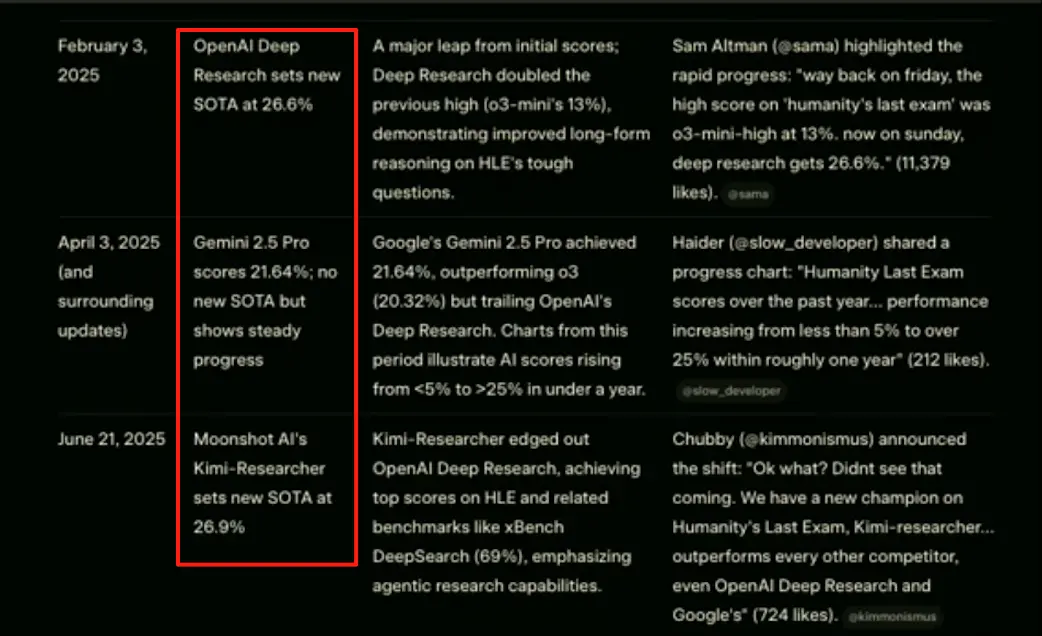 直播中提到HLE(Humanities Last Exam,人類最后的考試)進(jìn)行對(duì)比時(shí),分別介紹了OpenAI、谷歌旗下Gemini以及月之暗面Kimi三家公司,而Deep Researcher正