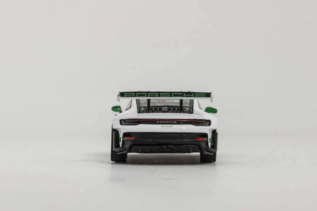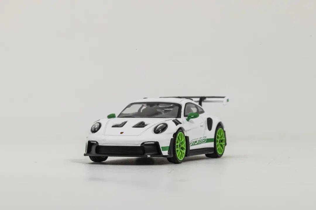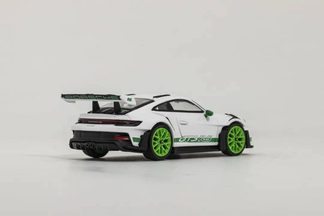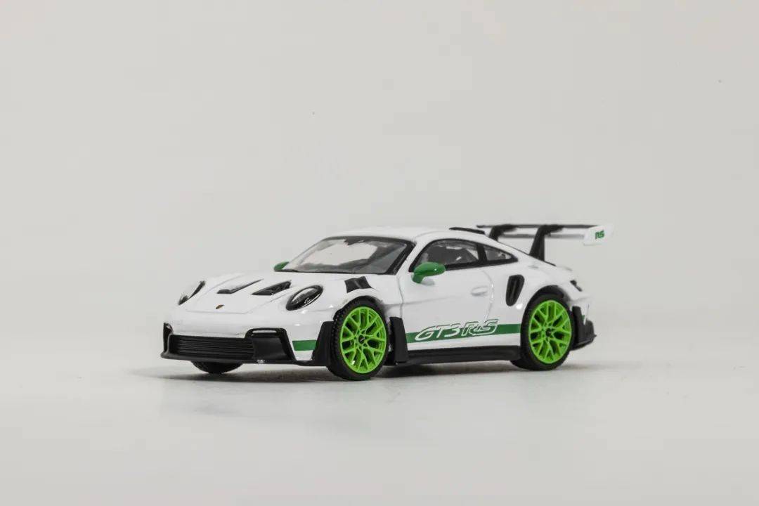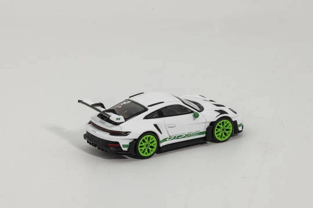 這次介紹的992 GT3RS模型來自MINI GT,模型材質為合金,比例為1/64,MINI GT的保時捷911系列也算是MINI GT品牌里較為成功的系列產品了,有部分車型二手市場也有溢價的情況,而這次介紹的992 GT3 RS之前也推出過其他顏色版本,后續也會有更多配色可選,我們試玩的是其中白色車身、綠色輪轂的版本。