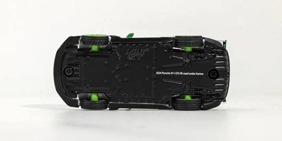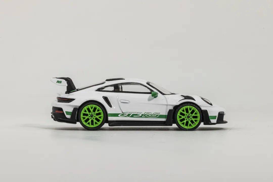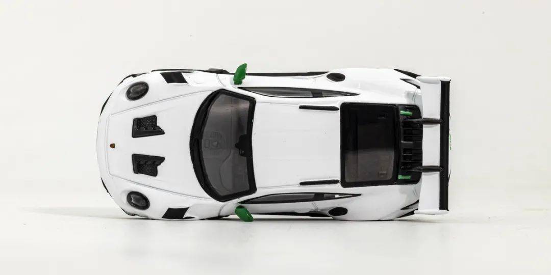 模型形準方面都做得比較好,形準沒大問題;MINI GT的漆面整體效果中規中矩,側面綠色的GT3RS的拉花應該是移印的,縫隙控制得還算不錯,但是白色車漆還是顯得稍肉,縫隙邊緣也有輕微露底情況;車門把手是浮雕的,后視鏡是綠色獨立軟膠的;前輪上方的通風格柵和后輪前側的通風口都是浮雕的,有點肉;前輪后側的風刀貌似做成鏤空的;車窗邊框是黑色漆刻畫的,基本沒有飛邊現象。