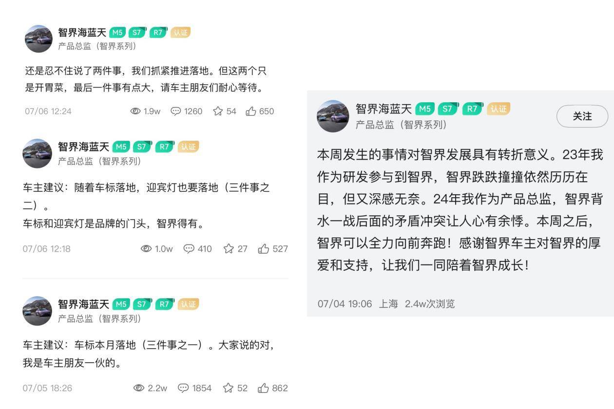 此前,在回答網友“建議智界品牌從奇瑞汽車獨立出來”的帖子時,智界系列產品總監海藍天回應:“正在按此落地”。7月,海藍天再度發文,表示智界正在推進三件事落地,一是車標,二是迎賓燈,最后一件事“有點大”。結合其7月發布的“本周之后,智界可以全力向前奔跑!”,疑似暗指智界將進一步獲得運營自主權。