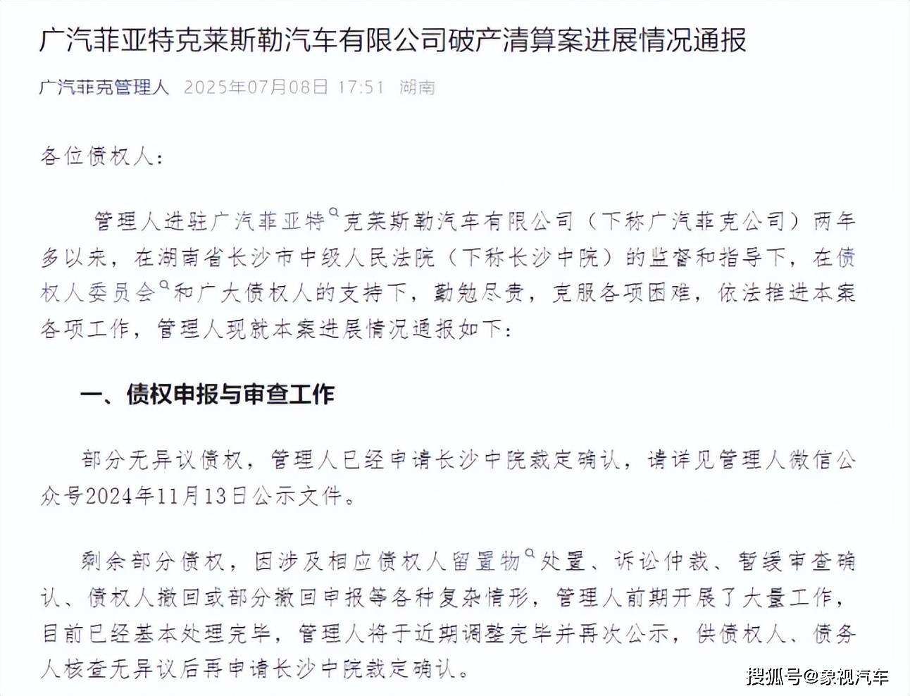 7月8日,廣汽菲克管理人發布了破產清算進展情況通報。