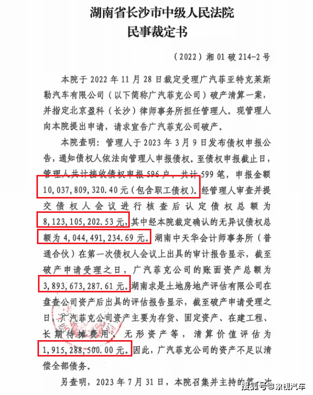 通報稱,因廣汽菲克公司已無重整可能,根據部分債權人意見,經債權人委員會討論,管理人已經申請長沙中院裁定宣告廣汽菲克公司破產。