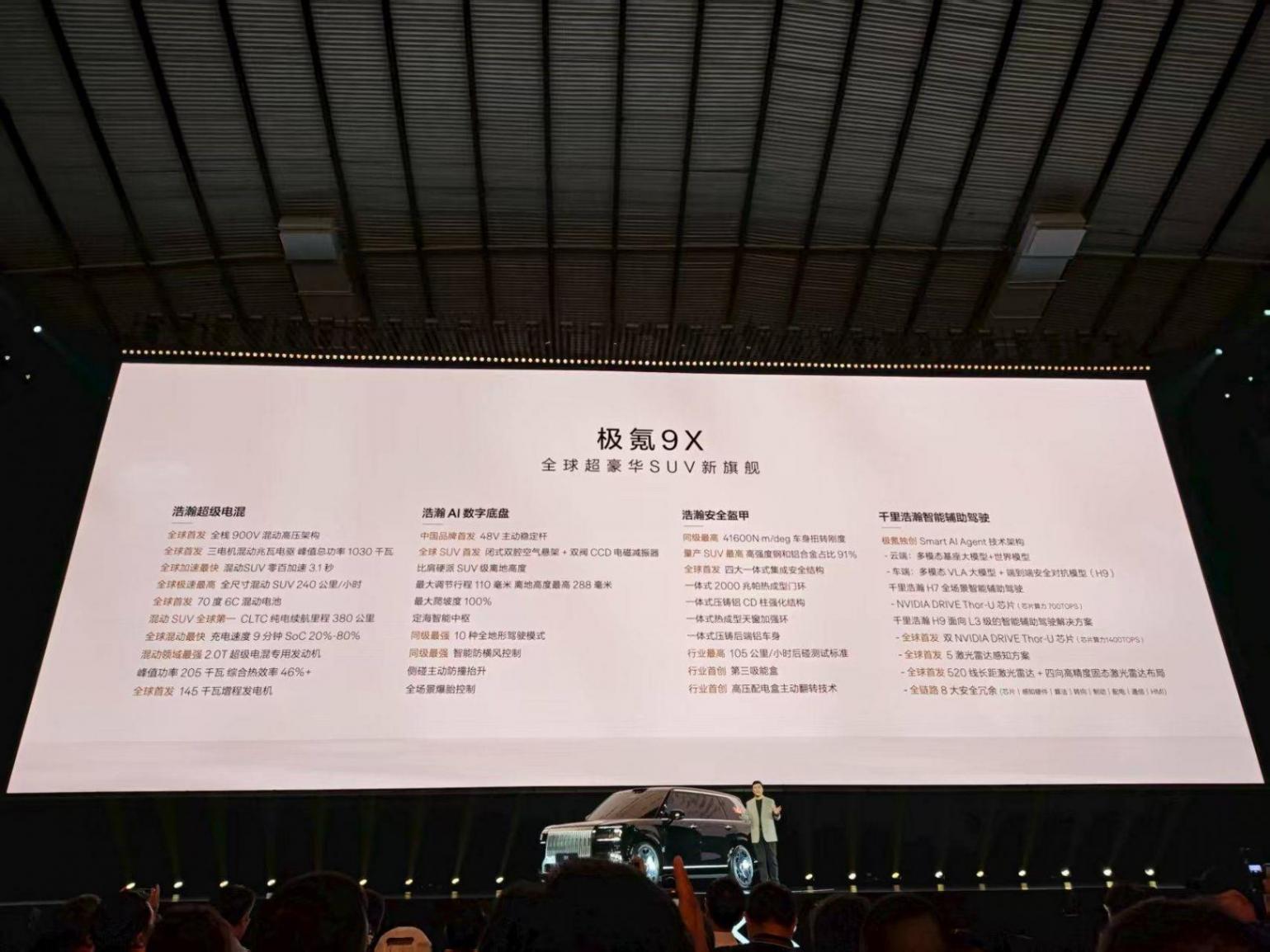 作為一款全尺寸豪華SUV,極氪9X擁有多項全球首發或全球第一的硬核科技。基于全球首款全棧900V高壓電混架構,極氪9X在全球混動SUV中純電續航里程最長、充電最快和加速最快,且是全球極速最高的全尺寸混動SUV。同時,極氪9X在全球SUV中首搭閉式雙腔空氣懸架和雙閥CCD電磁減振系統,中國品牌首搭48伏主動穩定桿全球首發5激光雷達和雙NVIDIA DRIVE Thor-U芯片,重新定義了豪華混動SUV價值標桿。