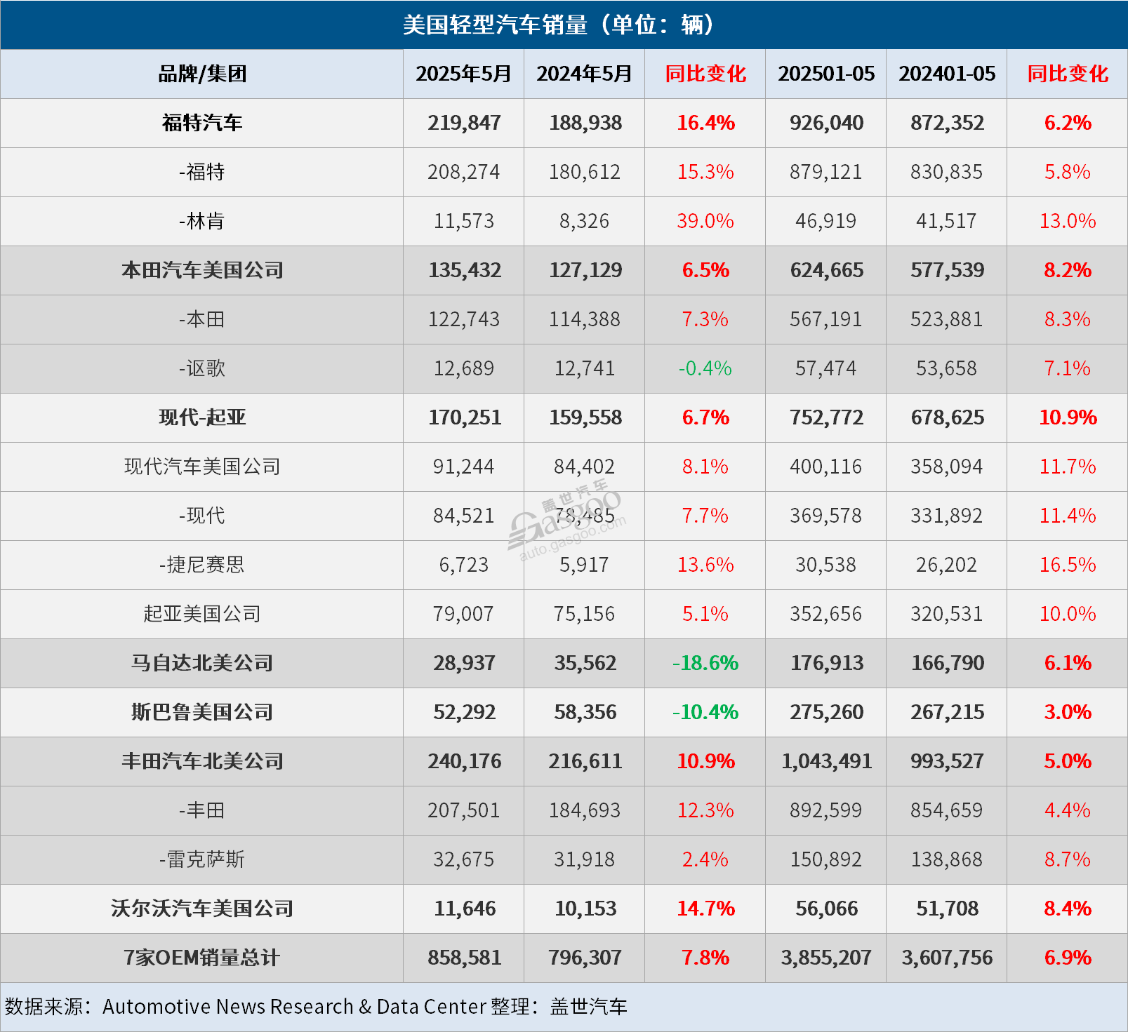 值得注意的是,福特品牌今年第二次、也是自去年1月以來第八次在美國市場的單月銷量超越豐田品牌。但從今年前5個(gè)月在美國的累計(jì)銷量來看,豐田品牌仍以13,478輛的銷量優(yōu)勢領(lǐng)先福特品牌。