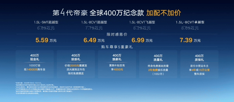 為紀(jì)念全球400萬輛銷量達(dá)成的里程碑時刻,吉利此次專門推出了第四代帝豪400萬紀(jì)念款。新車共有5MT超越型、CVT超越型、CVT飛越型、CVT卓越型四個版型,官方指導(dǎo)價為6.89萬元-8.69萬元,疊加1000抵14000的限時權(quán)益,售價直接來到了5.59萬-7.39萬元,進(jìn)一步拉低用戶的購車門檻。