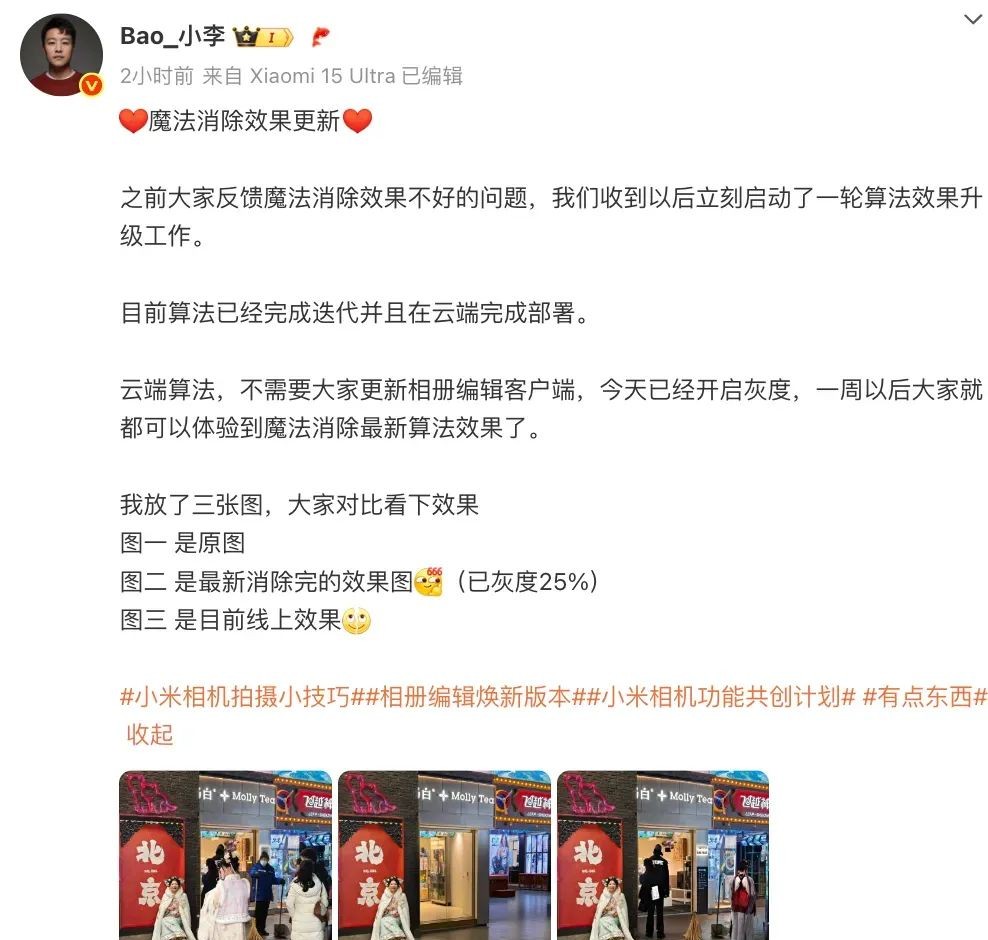 這次更新里還有個有意思的是魔法消除功能。不是手機系統改,而是直接云端升級,手機不用下載新程序就能用。今天已經有一部分人試了,下周應該就能全開了。這功能主要是能刪掉照片里多余的東西,比如路人或者雜物,用起來好像更順手了。