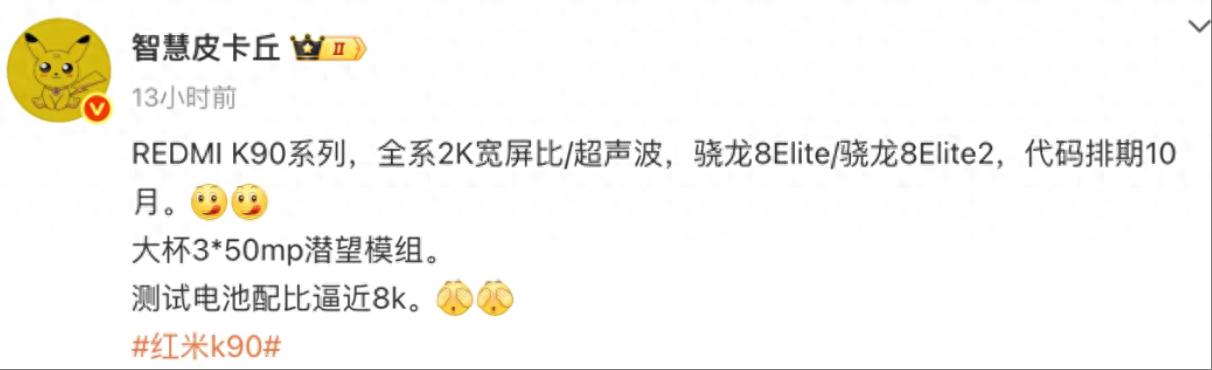 最近有爆料稱,REDMI K90 系列預(yù)計(jì)在今年 10 月發(fā)布,全系配備 2K 寬屏比/超聲波指紋,電池容量在 8000mAh 左右,搭載驍龍8 Elite/驍龍8 Elite2,大杯后置 3 顆 50MP 鏡頭有潛望鏡長焦。
