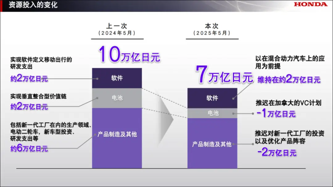 回到今年5月份,本田的財報會上,鑒于當前的產業發展,本田很篤定地說了,要削減在電動車領域的投入,將研發開支更多轉移到混動產品上。原本計劃投入10萬億用于純電車研發,經過調整后也降到了7萬億日元。