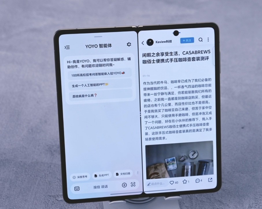 榮耀Magic V5的分屏體驗聚焦于“AI主動服務(wù)”。例如針對折疊屏用戶經(jīng)常進行分屏瀏覽的使用習慣,榮耀YOYO智能體進行了專門的適配優(yōu)化,現(xiàn)在用戶不但可以對單一特定的分屏界面進行勢識屏與對話問答,還可以單獨將YOYO智能體獨立成一個頁面進行交互。
