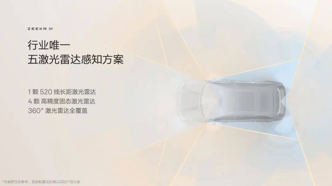 智駕硬件方面,極氪9X目前搭載的是吉利千里浩瀚智駕系統中最高規格的千里浩瀚H9,同步也會提供千里浩瀚H7版本。前者采用兩枚Thor U芯片,算力達1400TOPS,搭配一枚速騰聚創全新一代520線長距激光雷達,可在最遠300米外,精準識別長寬超過0.75米*0.75米的物體,同時還搭配了目前行業相對領先的四枚補盲固態激光雷達。此外還有5個4D毫米波雷達、12個超聲波雷達,13個高清攝像頭,2個涉水雷達、6個車外麥克風,共43個感知單元,將智駕的感知能力提高到了前所未有的高度。
