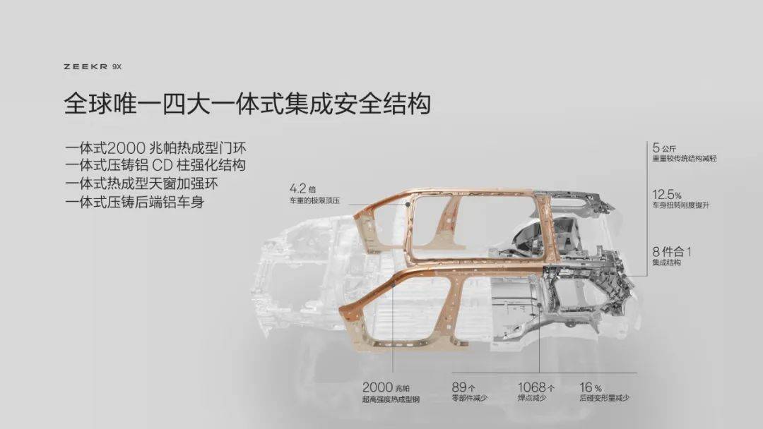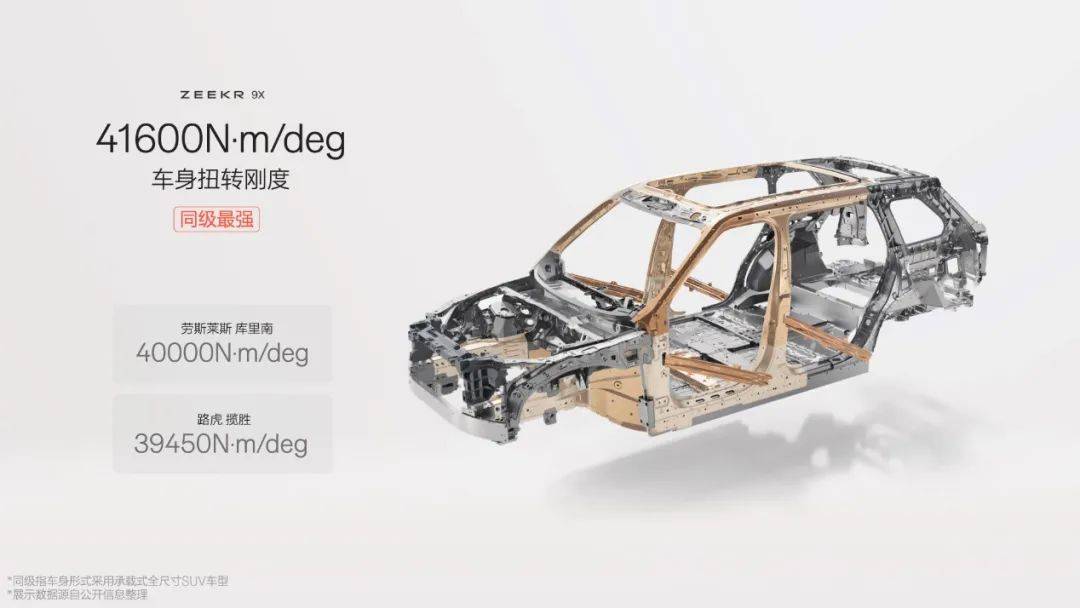 安全性能方面,極氪9X白車身高強鋼和鋁合金整體占比超過91%,其中1500兆帕以上的高強度熱成型鋼,和高強度鋁材的占比達到60%。后車身采用了包括C/D柱一體式壓鑄強化鋁結構,以及一體式壓鑄后段鋁車身,實現了減重,扭轉剛度提升至41600Nm/deg,最高追尾車速可達105km/h,車頂可承受11噸頂壓。