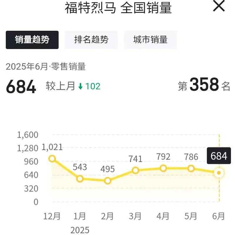 并且今年1-6月份,福特烈馬的銷量分別為543輛、495輛、741輛、792輛、786輛、684輛,6個月加在一起的累計銷量為4041輛。平均單月銷量不足680輛。