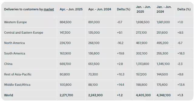 7月9日,大眾汽車集團(tuán)發(fā)布2025年上半年交付數(shù)據(jù)。上半年全球交付441萬輛汽車,同比增長(zhǎng)1.3%。大眾汽車集團(tuán) 2025 上半年全球交付的純電動(dòng)汽車數(shù)量同比增長(zhǎng)47%,達(dá)到465,500輛。其中,歐洲(增長(zhǎng) 89%)和美國(guó)(增長(zhǎng) 24%)增長(zhǎng)強(qiáng)勁,中國(guó)(下降 34%)發(fā)展放緩。