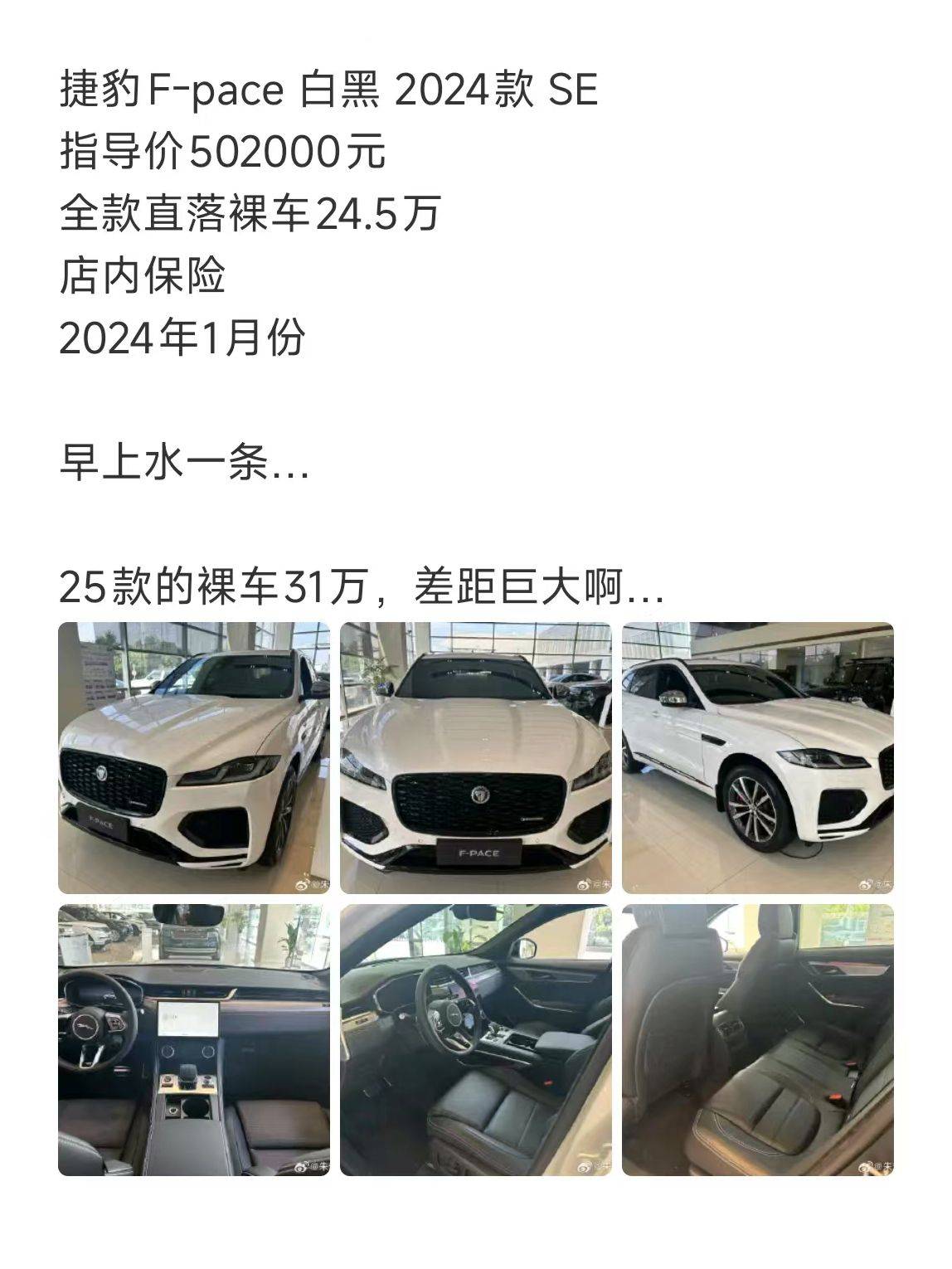 今天看到有博主發文:稱捷豹F-PACE 白黑 2024款 SE版本,指導價50.2萬那款,現在全款直落裸車價已經只需要24.5萬就能夠買了,而要求則是僅需在店內購買保險即可。