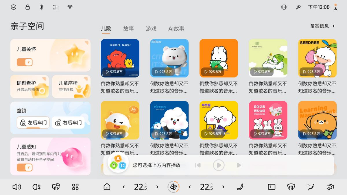 親子空間APP,集成兒童娛樂(lè)、即刻看護(hù)、兒童關(guān)懷、兒童感知、兒童鎖便捷顯示、兒童座椅調(diào)節(jié)6大高頻兒童功能,它能做到識(shí)別兒童上車后自動(dòng)開啟親子空間,然后提供不同年齡段海量?jī)和Y源,故事啊、兒歌啊、游戲等等非常多樣的娛樂(lè)資源,而且你不用擔(dān)心小孩看電視看時(shí)間長(zhǎng)影響視力,它有個(gè)觀影時(shí)長(zhǎng)智能管控系統(tǒng),可以設(shè)定觀影時(shí)長(zhǎng)以及休息時(shí)間,是不是非常的貼心;有時(shí)候?qū)殝尰蛘邔毎謫为?dú)帶小孩出門,小孩坐在后排兒童座椅,開車的時(shí)候擔(dān)心孩子亂動(dòng)或者有沒(méi)有睡著怎么辦,它還有即刻看護(hù)功能,后排影像可以在大屏上實(shí)時(shí)縮放,不用回頭看,在中控大屏里就能看到孩子的動(dòng)態(tài),是不是很安心,而且啊有一點(diǎn)非常值得表?yè)P(yáng),就是只要你用的是在官方商城選購(gòu)的兒童座椅,它就可以智能適配,支持通風(fēng)、加熱快捷調(diào)節(jié),小朋友也照顧到了,怎么樣,是不是關(guān)心到你心坎里去了。