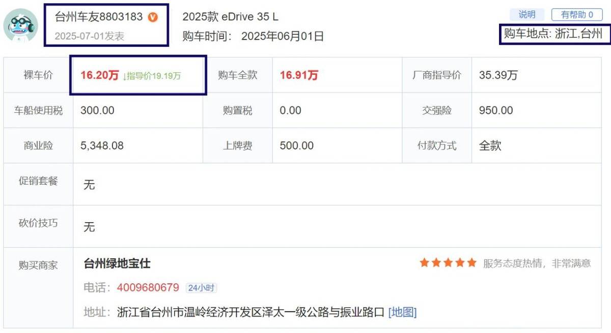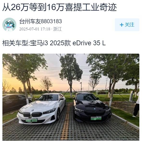 據臺州一位車友發文介紹,自己花16.2萬的裸車價格買了臺寶馬i3,新車總共落地花了17.5萬,其中保險費1.3萬,上牌800塊,車價16.2萬,看完他的這一提車價格,也著實是讓人不得不感到羨慕。