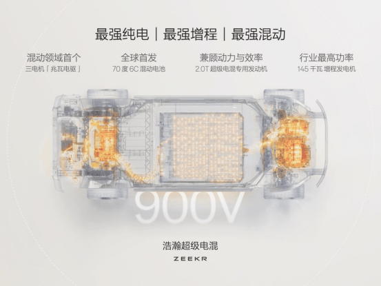 首先三電上,極氪9X搭載全棧900V混動高壓架構,搭載70度6C混動電池,CLTC純電續航里程可達380km,20%~80%充電時間僅需9分鐘,別忘了這可是臺插混車啊,卻有媲美純電車的體驗。極氪9X搭載浩瀚超級電混動力系統,由2.0T超混專用發動機+雙電機+發電機組成,一臺車就兼顧了純電、增程、混動三臺車的特性,主打一個“我全都要”。