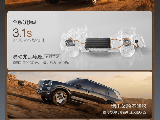 這套動力系統可以說既高效又強勁,2.0T超混發動機有46%的熱效率,讓它能夠比同級1.5T的SUV油耗還低5%~10%,動力系統峰值功率可達1030kW,最大馬力1400Ps,與小米SU7 Ultra的動力都相去不遠,3.1秒破百成績也能超過一眾超跑,上演一出力大磚飛!并且它即便是在饋電情況下,零百也只比滿電慢0.2秒。