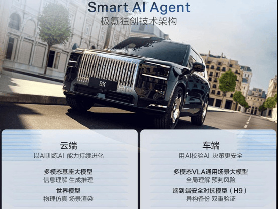 在智能駕駛輔助方面,極氪9X搭載了千里浩瀚H7以及面向L3級的千里浩瀚H9全場景智能輔助駕駛系統,千里浩瀚H9方案還搭載了雙Thor-U芯片,算力可達1400TOPS,Smart AI Agent技術架構還搭載了雙端到端大模型,能做到算法上的雙冗余,智能駕駛輔助系統進化和迭代速度也會更快。