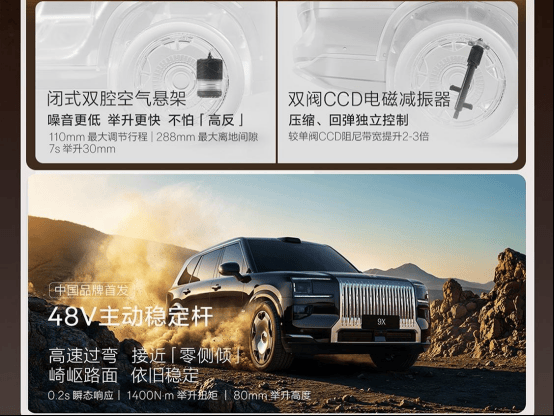 而在底盤上,極氪9X不僅用了閉式雙腔空氣懸架+雙閥CCD電磁減振,而且還加入了48V主動防傾桿,這在國產車中還是頭一次,之前都是像路虎攬勝、賓利添越、勞斯萊斯庫里南等百萬超豪車型才有搭載,有了這些硬件,可以極大提升行駛質感和穩定性。