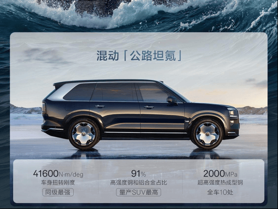 我們都知道極氪向來都有“公路坦氪”的名號,這正是對極氪車身安全的肯定,而極氪9X在車身安全上更進一步,全車有10處關鍵位置都用了2000兆帕的熱成型鋼,高強度鋼和鋁合金占比高達91%,扭轉剛度達到41600N.m/deg,可以說是同級最硬。